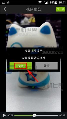 3)在视频预览页面点击右上角【下一步】,提示安装转码工具,点击【安装】。(如下图)