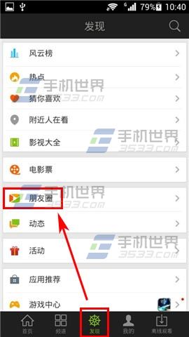 1)打开爱奇艺视频,选择【发现】栏,点击【朋友圈】。(如下图)