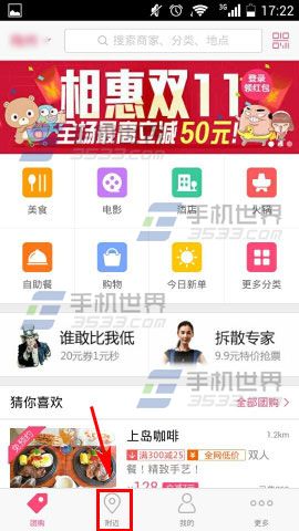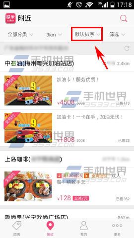 1)首先先打开【百度糯米】,进去之后点击【附近】。(如下图)