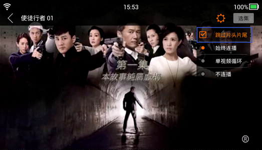 5、进入播放页面,点击右上角的“设置”图标在弹出的下拉菜单,勾选“跳过片头片尾”这样你观看电视的时候,就再也不用担心有片头片尾了。