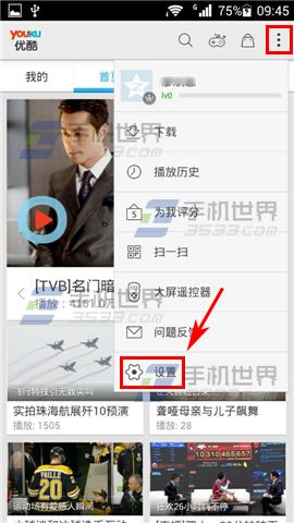 1)打开手机优酷,点击右上角【...】,在弹出菜单选择【设置】。(如下图)
