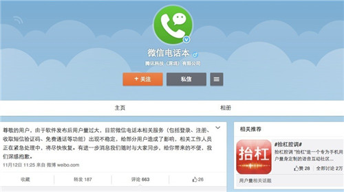 微信电话本官方微博表示:“尊敬的用户,由于软件发布后用户量过大,目前微信电话本相关服务(包括登录、注册、收取短信验证码、免费通话等功能)出现不稳定,给部分用户造成了影响,相关工作人员正在紧急处理中,将尽快恢复。有进一步消息我们随时与大家同步,给你带来的不便,我们深感抱歉。”