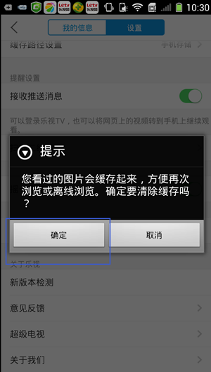 3、然后在显示出的界面中点击“确定”按键。这样乐视影视手机版的图片缓存就清除成功了。