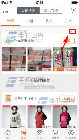 1)首先先打开手机淘宝,进去之后点击【微淘】,接着选择想屏蔽的店铺点击【三点】。(如下图)
