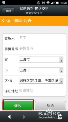 4、在“填写收货信息”页面,根据实际情况,填写自己的收货地址信息,填写完毕,选择确定,回到“易迅购物-确认交易”页面,