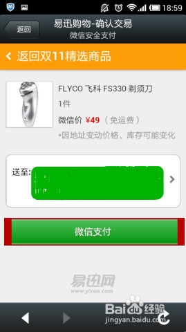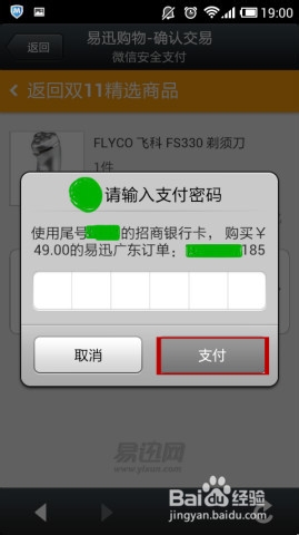 5、在“易迅购物-确认交易”页面,点击“微信支付”,弹出输入密码窗口,