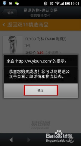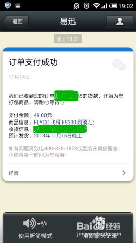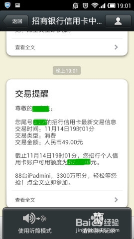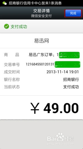 8、整个购物流程相当便捷,购物成功后,招商银行信用卡中心发来交易提醒以及易迅官网微信公众账号发来订单支付成功提醒。