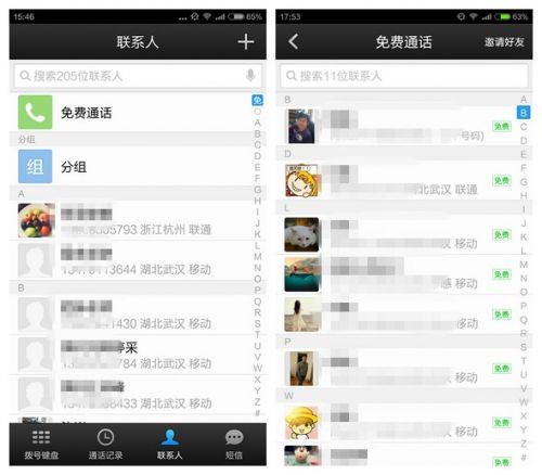 在“免费通话”分组中,已经有10几个手机通讯录小伙伴也注册上了,拨打几次后,发现双方都在WIFI环境下,音质较好。如果一方使用移动流量通话,信号不好,或者2G信号的话,就断断续续听不清楚。