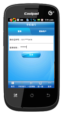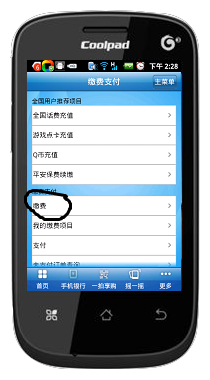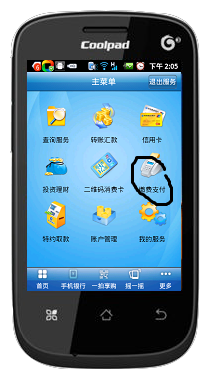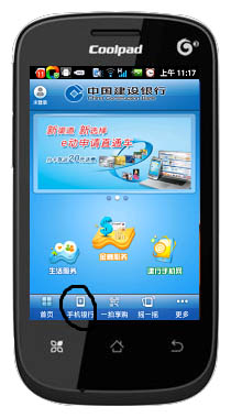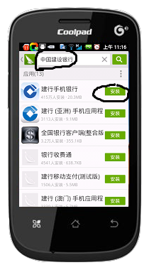 在你的手机里下载安装中国建设银行客户端。下面我以酷派手机8020,下载、安装、使用建行交话费,进行详解: