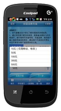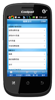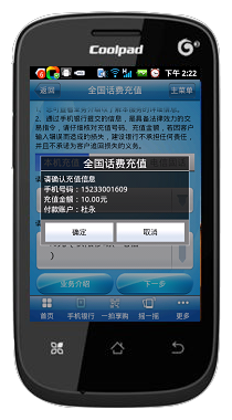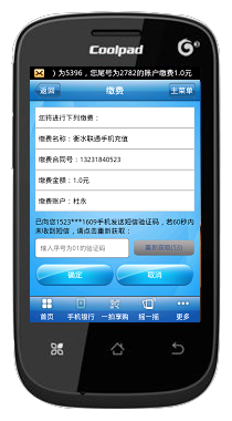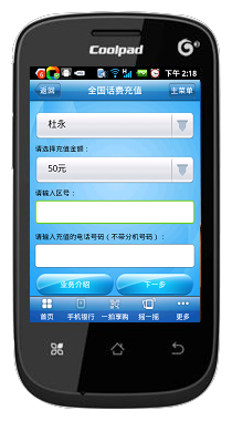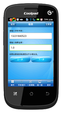 2、安装完毕后打开,进入受首页,选择手机银行(下图1),输入密码进入主菜单(下图2),会出现缴费支付(下图3),点击进入(下图4)。图4第一行是全国话费充值,点击进入(下图5)本机充值话费(10元数额的仅限移动和电信用户)有10元、50元、100元、300元、500元。如若本机为移动和电信,直接选择要充值的数额,点击下一步进行下步操作。若给他人充值,点其它手机(下图6)输入号码,点击下一步进行下步操作。若为电信固话则选择电信固话(下图7)内输入电信号码(电信固话没有10元数额话费)。下图8为为本手机缴费,点击下一步出现的界面。点击确定,则缴费成功。