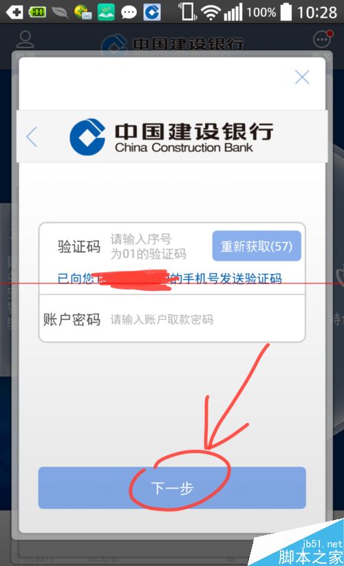 8、已向你的手机发送验证码,录入收到的验证码,还需要录入你账户取款密码。进行核对。点击下一步,进行手机银行密码设定,完成手机银行开通。有需要可以参考经验:建设银行手机银行怎么使用?以及注意事项