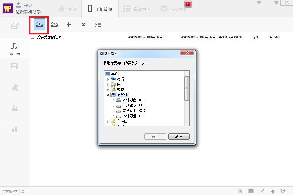 本地电脑中已存在的音乐文件夹导入到您的手机中。选择导入键即可看到文件夹选择。选择所需要的音乐文件即可导入。