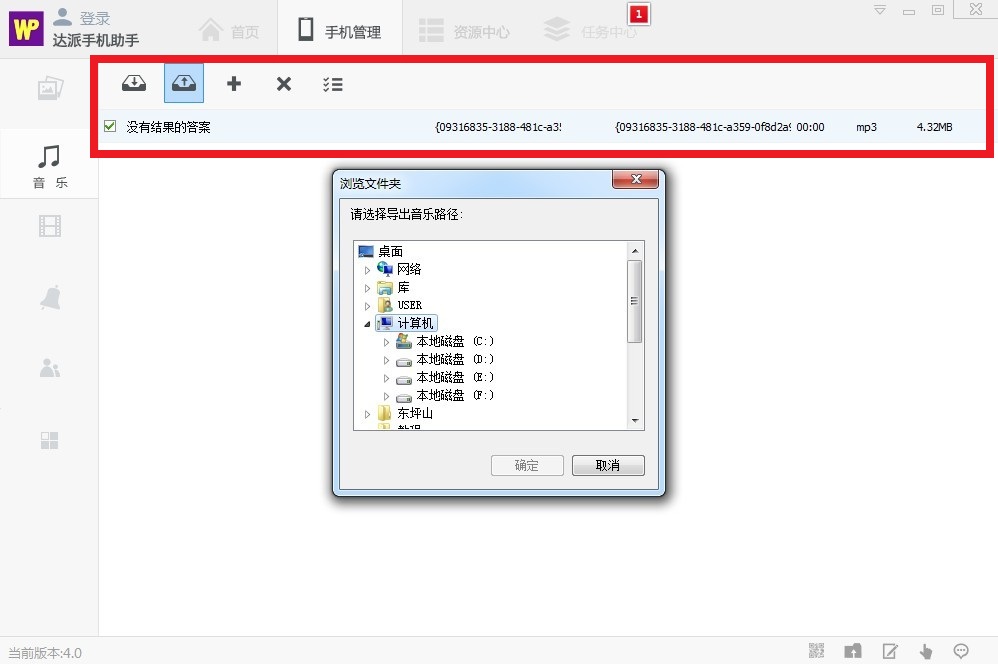 连接达派手机助手后即可获取到您手机中的音乐文件,您可以直接选择所导出的音乐,可以单项选择,或选择全选,将音乐导出到您需要存储的位置。