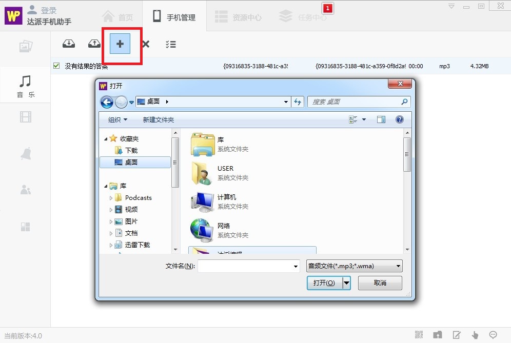 达派手机助手资源中心提供丰富的音乐资源,您可以直接选择资源中心音乐下载将音乐下载至手机,或选择本地已有的音乐点击添加即可将本地资源添加至手机中。