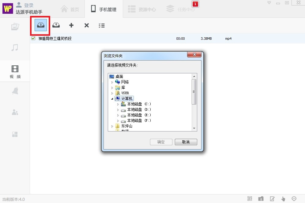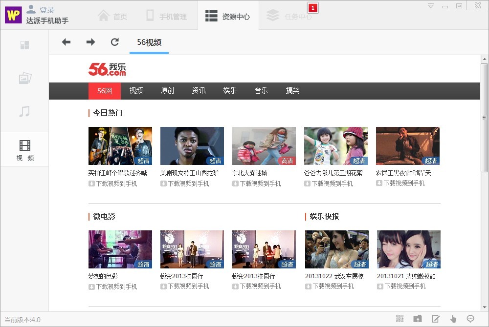 达派手机助手资源中心提供丰富的视频资源,您可以直接选择资源中心,视频下载,将视频下载至手机,或选择本地已有的视频点击添加即可将本地资源添加至手机中。