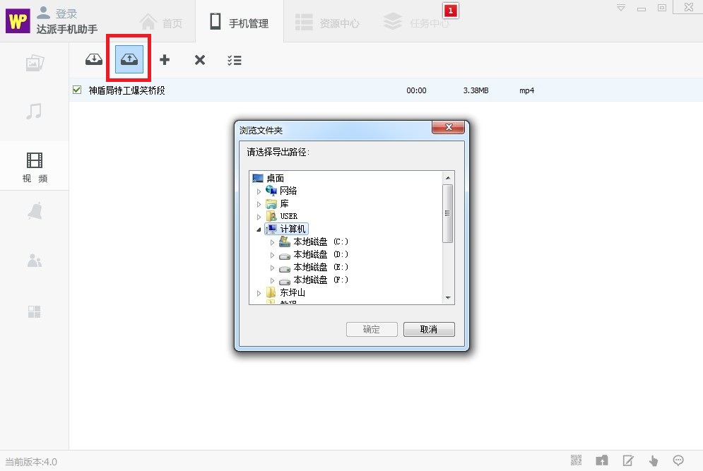连接达派手机助手后即可获取到您手机中的视频文件,您可以直接选择所导出的视频,可以单项选择,或选择全选,将音乐导出到您需要存储的位置。