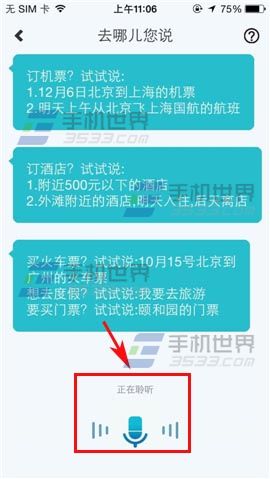 1)首先打开去哪儿旅行,点击【语音】,进入界面显示正在聆听便可以说哪儿到哪儿的机票。(如下图)