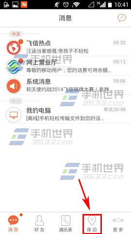 1)首先先打开【飞信】,进去之后点击【身边】。(如下图)