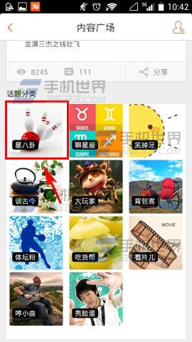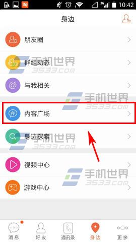 2)接着点击【内容广场】,进入页面后把页面向上一滑,滑到最下面选择话题类型点击一下。(如下图)