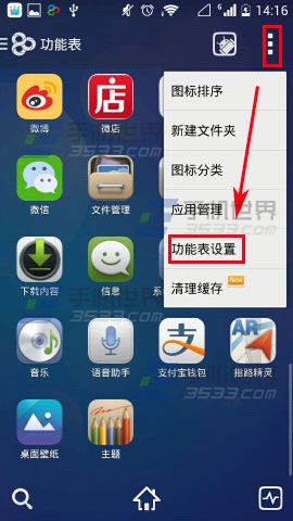 1)首先先进入GO桌面,接着点击下方的【符号】进去后点击【三点】弹出提示后点击【功能表设置】。(如下图)