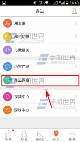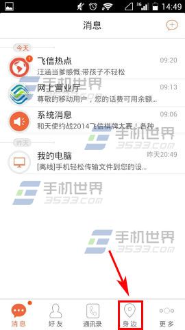 1)首先先打开【飞信】,进去之后点击【身边】。(如下图)