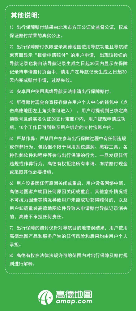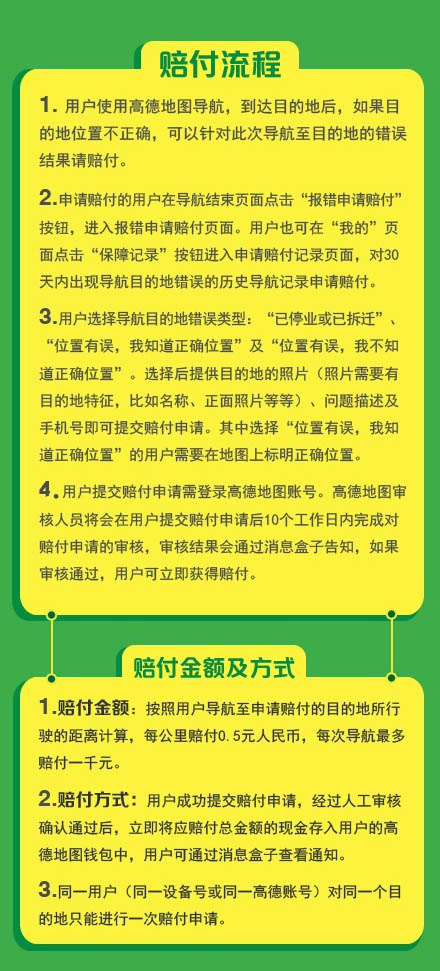赔付金额按照用户导航至申请赔付的目的地所行驶距离计算,每公里赔付0.5元,每次导航最多赔付1000元。赔付金额现金存入用户的高德地图钱包中,可提现。