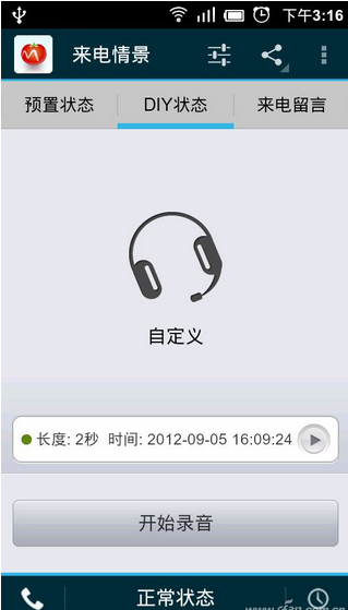 如果觉得30种情景不够用,也可以点击界面上方的“DIY状态”按钮,然后点击“开始录音”按钮自己制作来电情景。录制的时候,最好加一些现场声音效果。录完后点击“结束录音”按钮保存起来,再点击“自定义”图标将其置为绿色文字,便可使用自制的来电情景进行应答了(图4)。