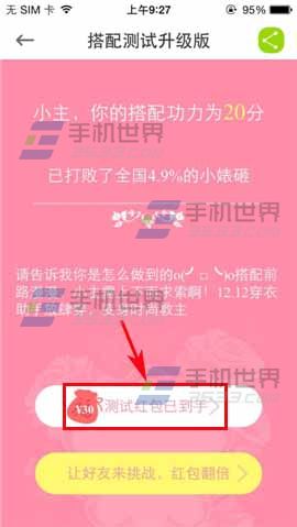 2)开始回答问题,十道题答完之后便会显示测试结果,点击【测试红包已到手】。(如下图)