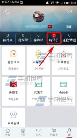 1)打开手机天猫,点击右下角的【我】,然后点击【待评价】。(如下图)