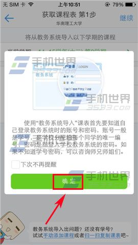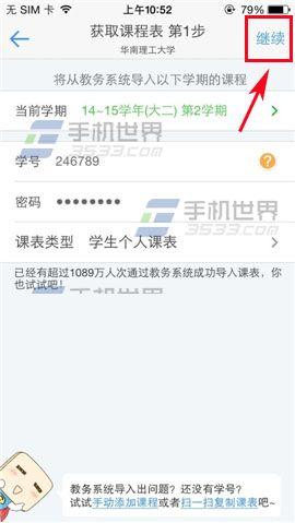 3)在界面输入学号、密码、和课表类型,点击【继续】即可导入学期的课程。