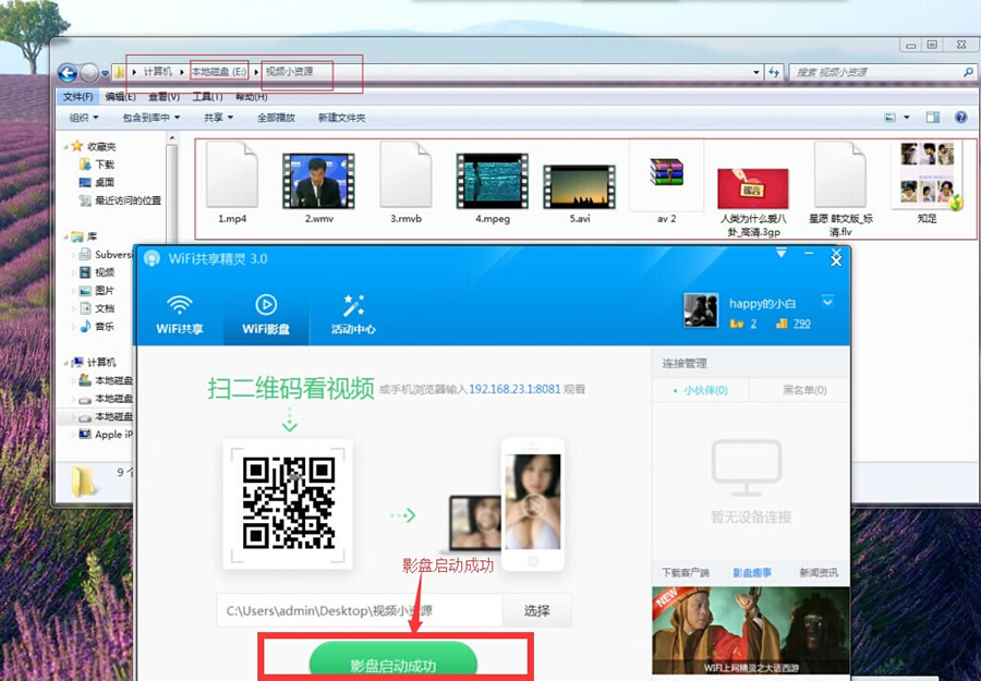 手机下载WiFi上网精灵-----电脑上成功开启免费WIFI后,选择有资源的文件夹(小资源、电影、歌曲)-----启动影库-----打开手机里上网精灵的影盘(或者扫描二维码或手机浏览器输入)-----直接观看各种视频小资源。