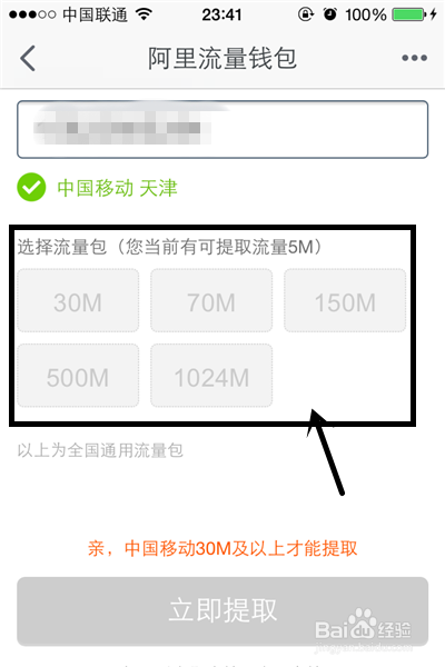 6、比如,小编输入一个天津的,这时候会显示一系列的不同规格,并不是说只要有流量就可以提起,一般来说30M是一个起点,大家一定要注意啦。