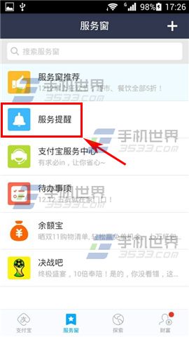 1)打开手机支付宝,点击进入【服务窗】栏。(如下图)
