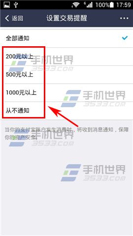 3)点击【设置交易提醒金额】,然后你就可以选择一个金额了。(如下图)