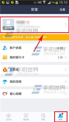 1)首先打开手机支付宝,点击【财富】,在界面上方点击用户账号,点击【账户保护】。(如下图)