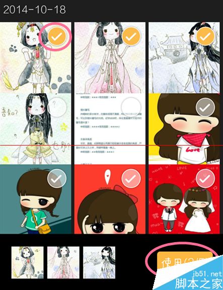 2、从你的相册导入照片,在每个图片右上方打勾,选中添加,已选照片会出现在下方。也可以点击一张图片进入后,在右上方打勾,点击“下一张”继续添加。