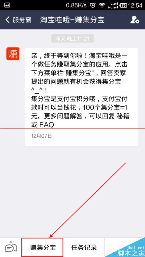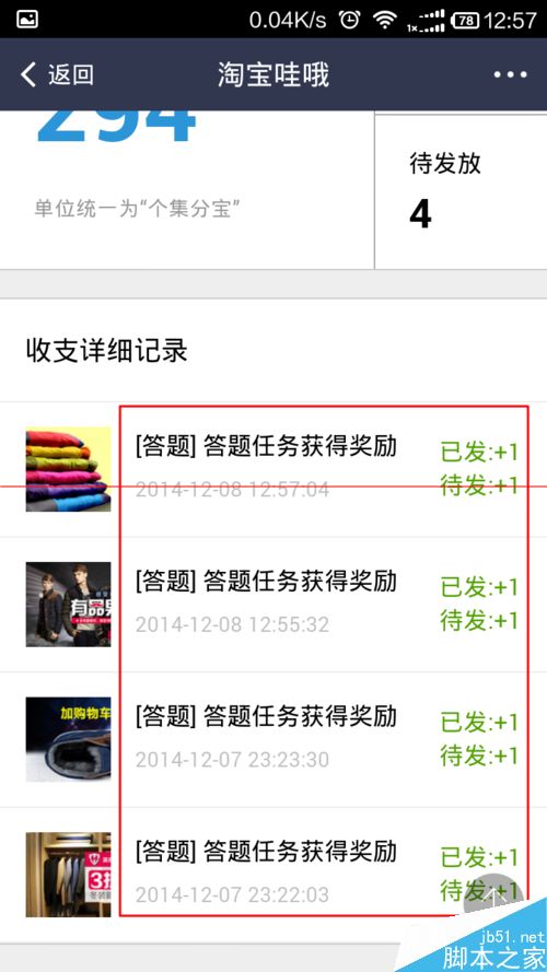 10、完成每天的活动之后,再次返回淘宝哇哦,选择任务记录,就可以查看当前已经发放的集分宝,以及完成任务的情况和等待发放的集分宝