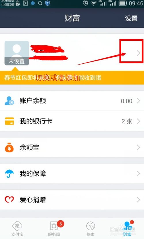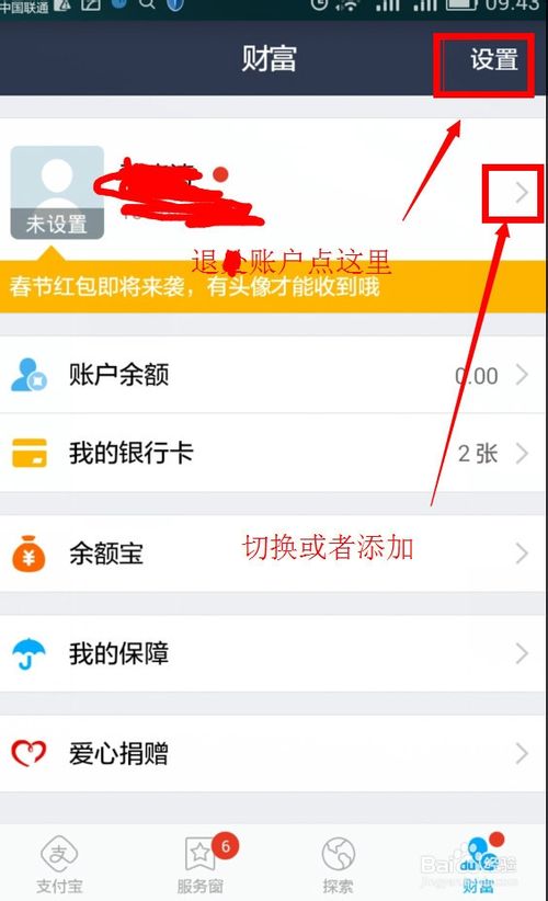 1、在支付宝界面点击右下角的财富可以退出、切换、添加账户。