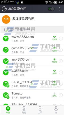 3)或者周围没有360专属的免费wifi,但有挖掘到的免费wifi也可以连接的哦,这个就不用耗费领取的免费时长(如下图)