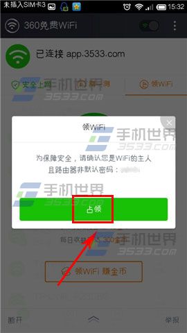 1)打开360免费wifi,连接了wifi以后点击右边的【领wifi】(被别人占领了的wifi会显示已被领,就占领不了了),接着点击【领wifi赚金币】。(如下图)