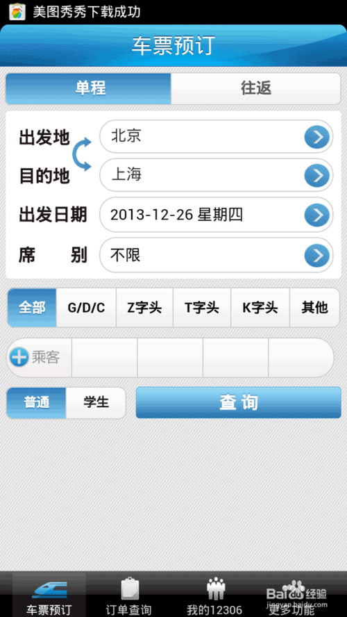 2、进入后,会有一系列的选择,需要我们来选择。例如出发地,目的地,出发日期的选择,席别,以及车次的打头,也就是我们需要坐什么类型的火车,当然,还有区分人群的普通票或者是学生票,都选择好了后,点击查询。