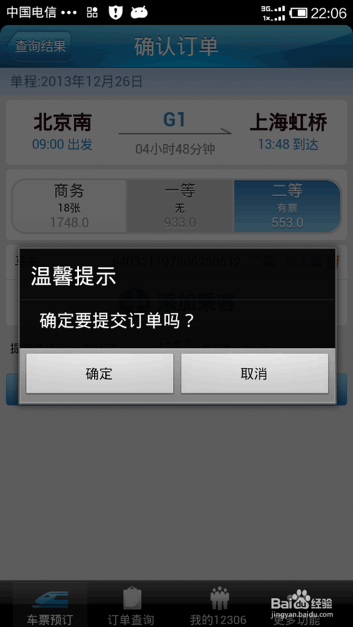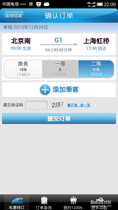 3、好了,查出来后,选择有座的车次,点击一下那个车次,这个时候,会出现始发站至终点站,票务情况,价格情况等。点击添加乘客。按照下面的提交验证码,再点击提交定单。给出了确定要提交定单吗?点击确定。
