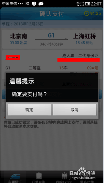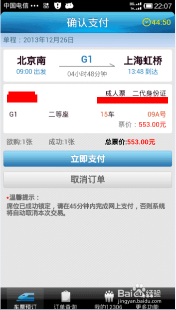 4、这时,会提示你有多少余票情况。屏一闪后,进入支付的界面,如果你想购买这趟车的话,就在45分钟的时间内,进行支付,否则会自动取消交易。如果你犹豫不想要这趟车的话,可以点击下面的取消订单。