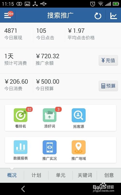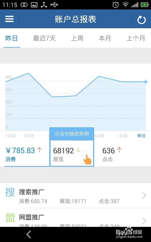 7、划过后,进入百度推广助手手机版的主界面,可以看到点击,展现,消费等信息。