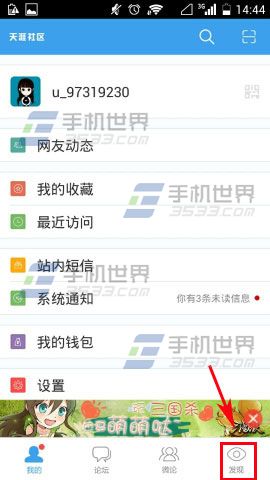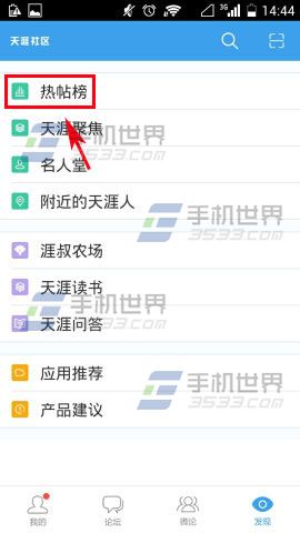 1)首先先打开【天涯社区】,进去之后点击【发现】,接着点击【热贴榜】。(如下图)