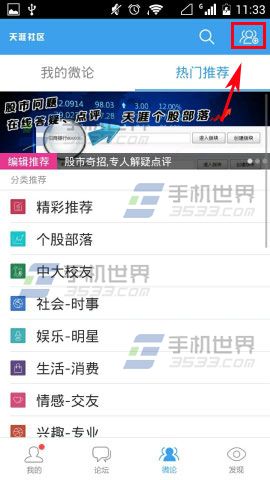 1)首先先打开【天涯社区】,进去之后点击【微论】,接着点击右上角的【人像】。(如下图)