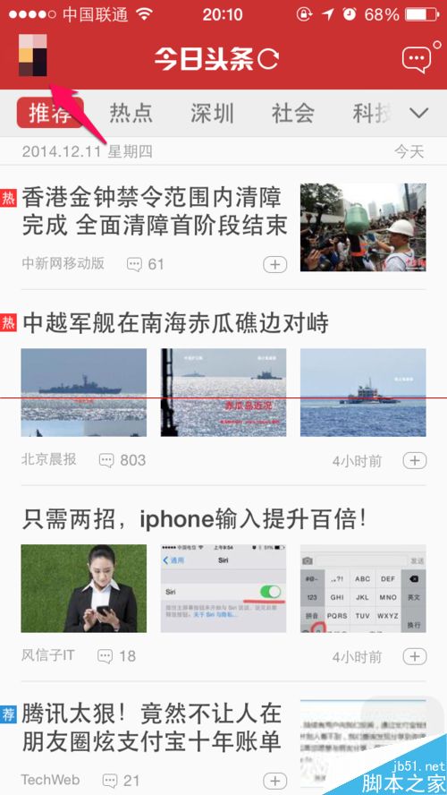 1、在今日头条点击左上角自己的头像。