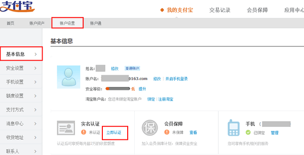 1、打开www.alipay.com,登录支付宝账户——【账户设置】——【基本信息】,点击【立即认证】;