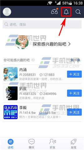 1)打开手机百度贴吧,点击右上角的【铃铛标志】。(如下图)