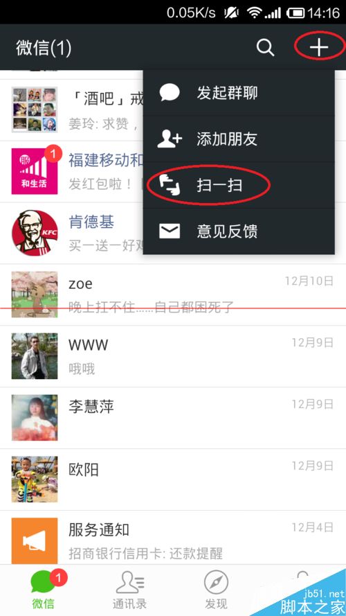 2、或者打开界面顶部的”+“符号,在下拉菜单中找到”扫一扫“。
